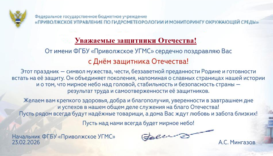 Новости В начало | Назад Страница 4 из 222 Далее Погода первой недели марта на Средней Волге. 2 марта 2026 г. 15:59 ФГБУ "Приволжское УГМС" Теплое начало марта 27 февраля 2026 г. 15:37 ФГБУ "Приволжское УГМС" Прогноз погоды на март 2026 года по территории ФГБУ "Приволжское УГМС" 26 февраля 2026 г. 18:11 ФГБУ "Приволжское УГМС" Поздравляем с Днём Защитника Отечества! 23 февраля 2026 г. 15:00 ФГБУ "Приволжское УГМС" Погода последних дней зимы. 23 февраля 2026 г. 13:41 ФГБУ "Приволжское УГМС" Погода выходных дней 20 февраля 2026 г. 12:58 ФГБУ "Приволжское УГМС" Погода 17-20 февраля 2026 года 16 февраля 2026 г. 15:12 ФГБУ "Приволжское УГМС" Погода меняет характер 13 февраля 2026 г. 14:50 ФГБУ "Приволжское УГМС" Погода 10-13 февраля 2026 года 9 февраля 2026 г. 14:59 ФГБУ "Приволжское УГМС" Погода в предстоящие трое суток. 6 февраля 2026 г. 14:36 ФГБУ "Приволжское УГМС" В начало | Назад Страница 4 из 222 Далее Всего новостей: 6848