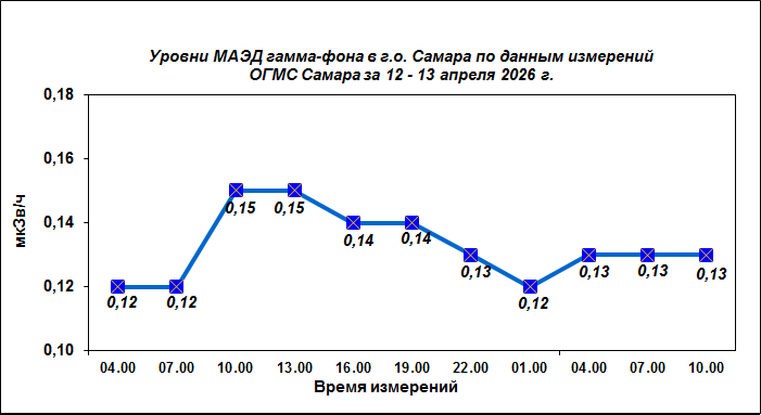 Результаты наблюдений за уровнем гамма-фона на метеостанции (ОГМС) Самара за последние сутки приведены на диаграмме:
